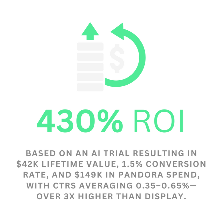 Audio streaming typically delivers 2x–4x return on ad spend (Source: IAB).